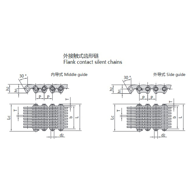 - Tannkjede med innvendig og utvendig tannkobling:Kombinerer fordelene ved innvendig og utvendig innfesting. Ideell for høyhastighets-, variabel hastighets- og variabel belastningsforhold. Minimerer polygonale effekter, støt, vibrasjon og støy, samtidig som overføringseffektiviteten økes.