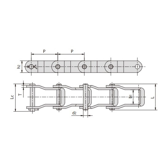 - Spesiell kjedekonstruksjon laget av smidbare støpejernslinker forbundet med stålpinner, uten skille mellom indre og ytre lenker for forenklet design og robust ytelse.